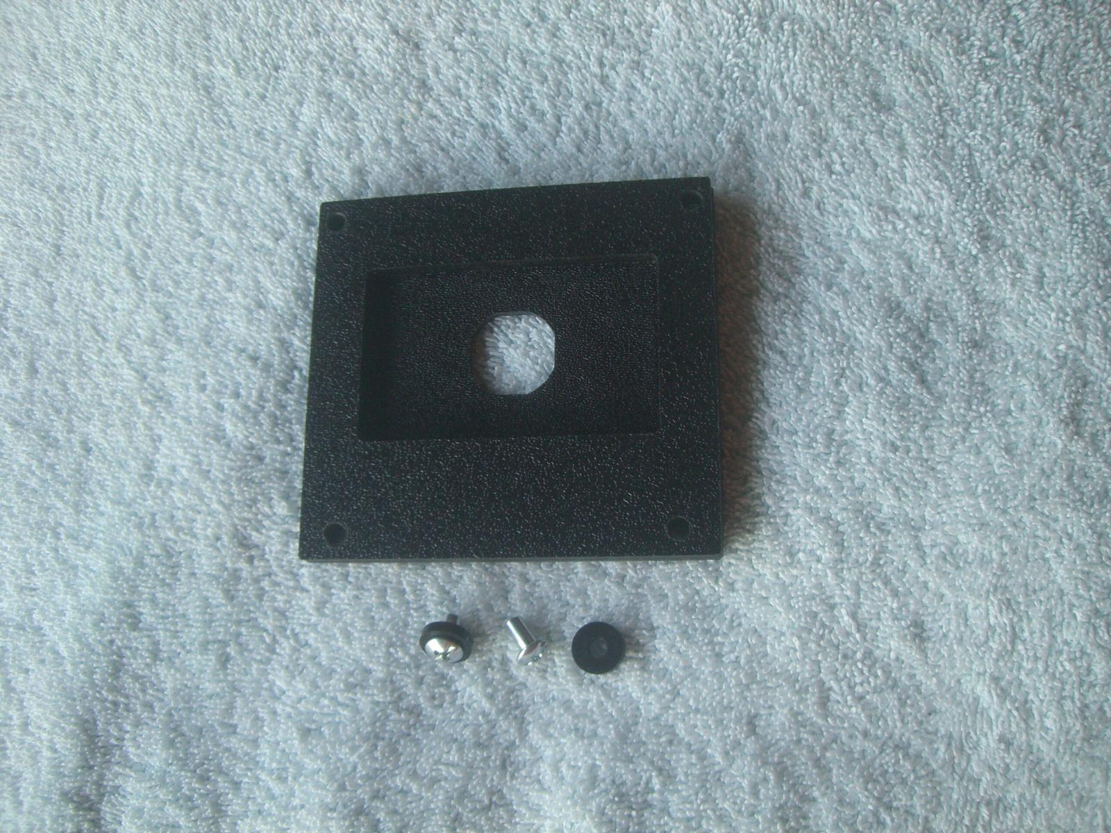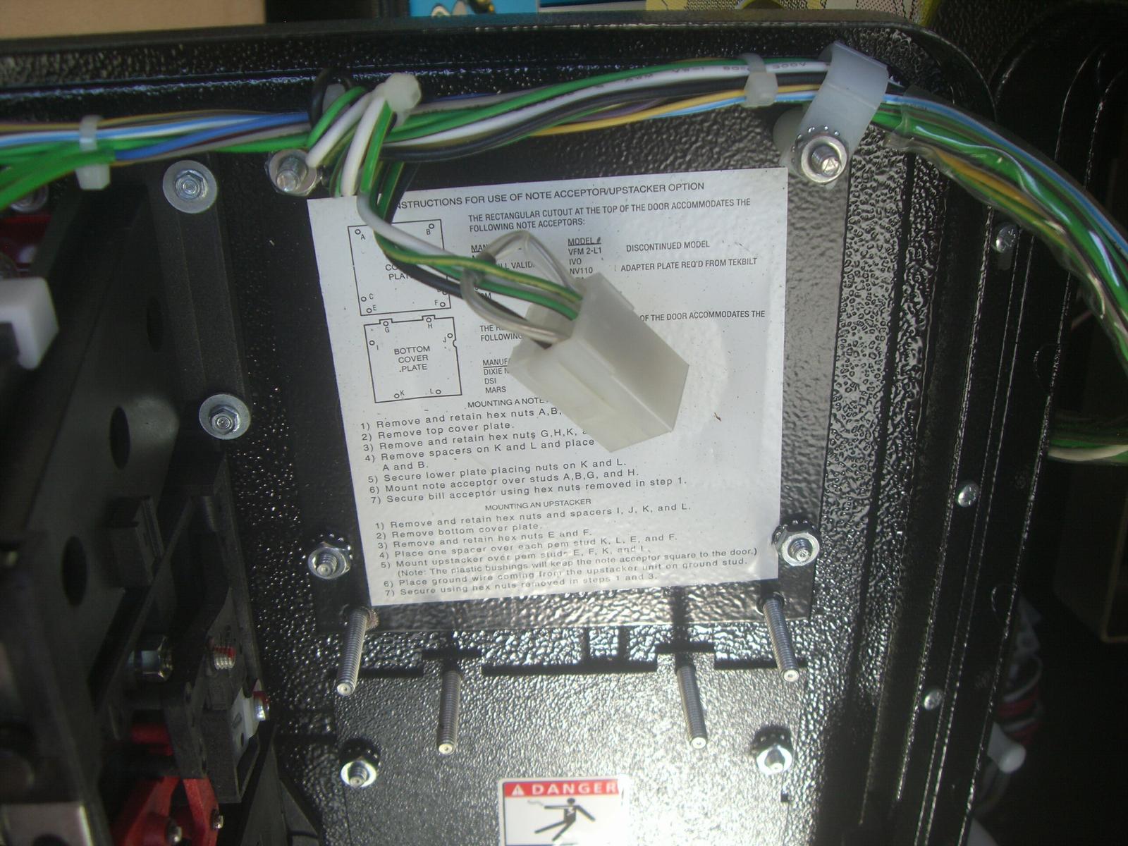 Remove the 4 nuts holding the bill acceptor blank with an 11/32" nut driver  Install the plate in the backside of the door over existing studs. Install the two barrel nuts with spacers first Reuse one of your existing nylon spacers at the top left stud and a nut. Flip the cable clamp to face outwards and install over top right stud and then a nut.