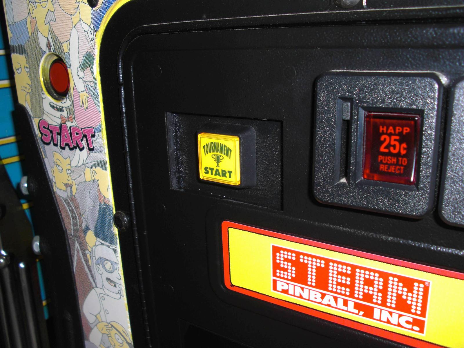 Remove your tourney button from lockdown bar and insert into plate from the front. Now simply reroute your switch wires (not shown) and plug it into the button. DONE! Shown on my Simpsons Pinball Party with hole plug on lockdown bar. Plug available at finer pinball parts retailers TSPP didn't come with a tourney button but it is easily added with my kit. I needed to buy a button with switch and the wiring harness. Enable tournament mode in setup and it's ready for even more fun!